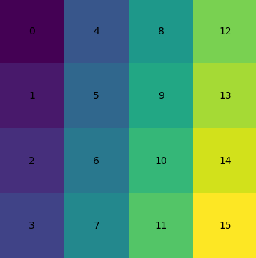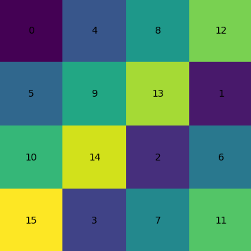 A plaintext block is a 4-by-4 matrix of bytes (represented in rust by an array of 16 8-bit integers [u8, 16]). It looks like this: