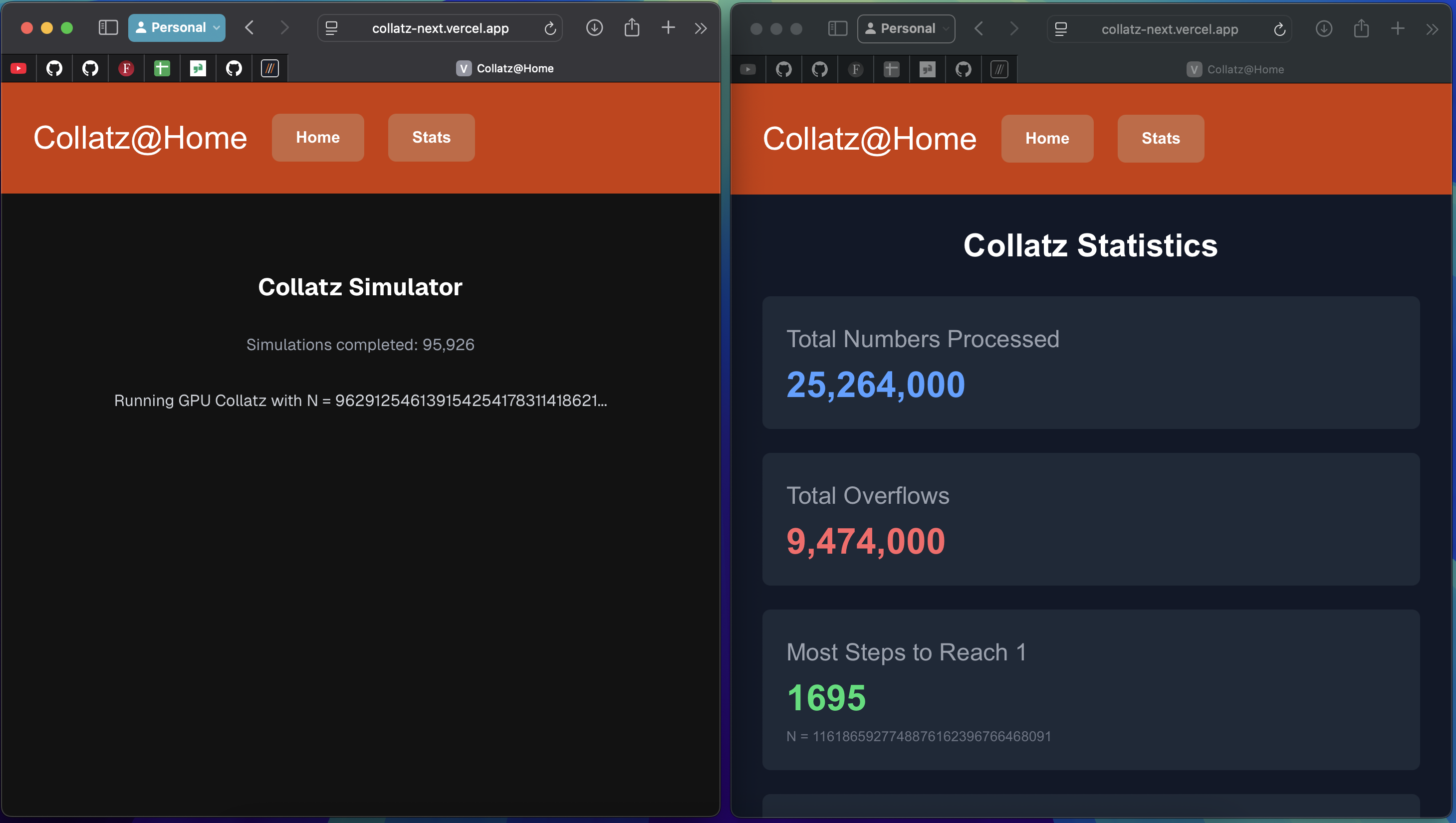 I’ve chosen to use Rust compiled to wasm to implement this, but you can use whatever you want. The code that I used is in this repository. I have an HTML button that runs this code on click. do_gpu_collatz calls my rust wasm function which then calls my WGSL code on the GPU and returns a list of u32s. I can then post this to my server to compile together the results.